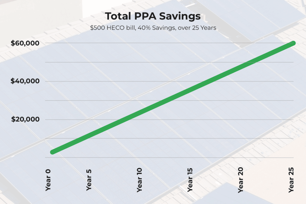 Most Hawaii homeowners save 20–40% on electricity from day one. For example, a household with a $500 monthly HECO bill could pay around $300 under a solar PPA, saving about $200 per month, $2,400 per year, and roughly $60,000 over 25 years